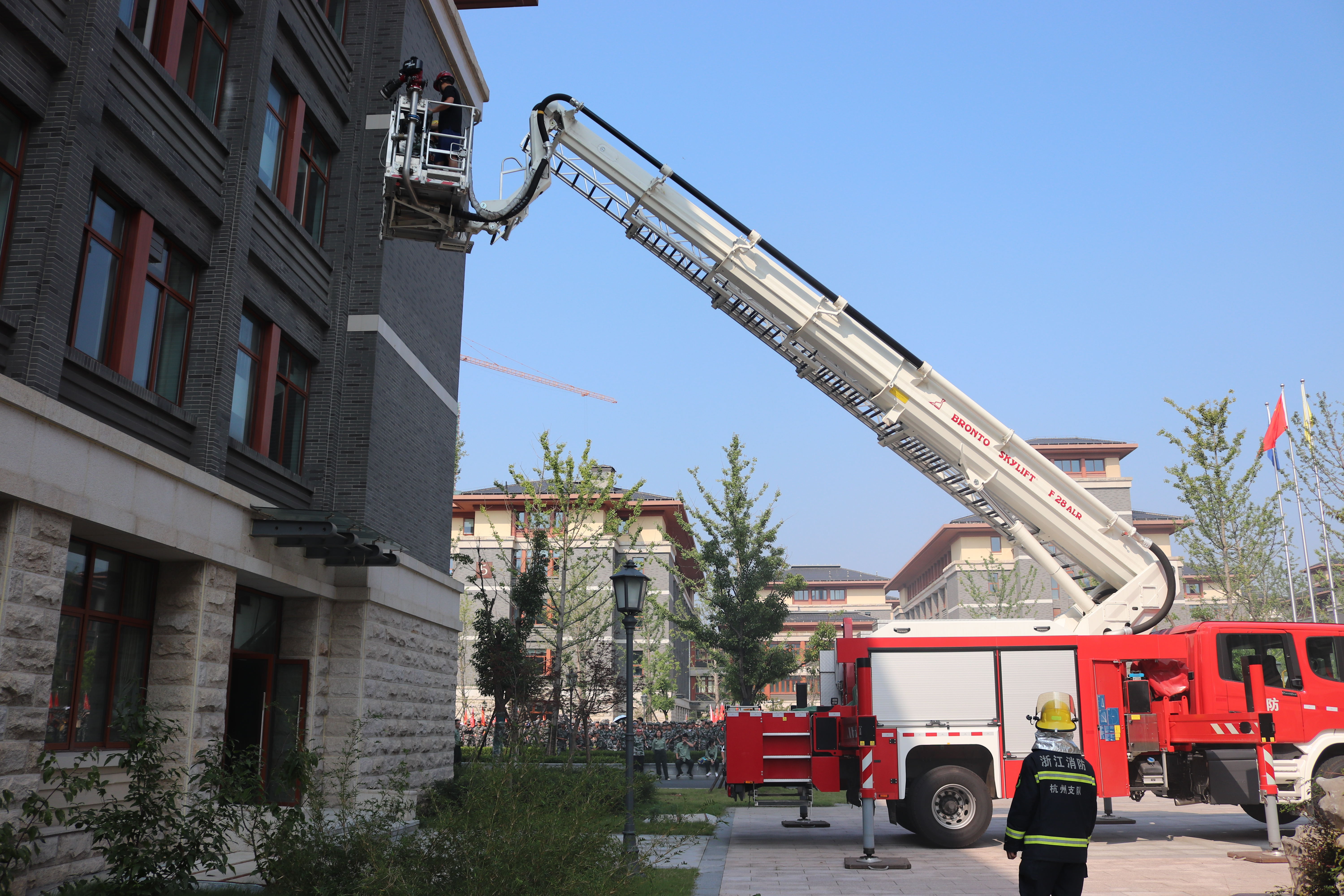 临安消防救援大队接到报警后迅速到达火灾现场,展开灭火行动,现场火势被控制。此时,两名学生被困三楼教室,消防官兵举升云梯后成功解救受困人员。九点,现场火被扑灭,总指挥宣布演习结束。