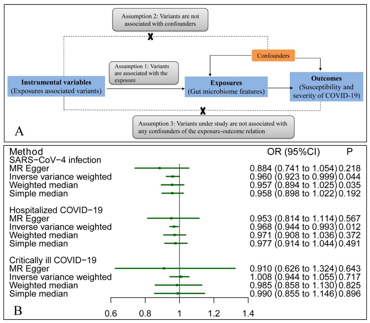 新型冠状病毒肺炎(COVID-19)是由SARS-CoV-2病毒引起的一种传染病。大多数感染此病毒的人会出现轻度至中度呼吸系统疾病。肠道菌是一类生活在机体肠道中的微生物群落的总称,肠道菌与多种人类疾病的发生直接相关。肠道菌结构和组成改变与COVID-19间的关联得到广泛讨论,但这种关联是基于观察性研究,可能会受到混杂因素的影响,之前尚未阐明肠道菌与COVID-19间因果关系。该研究利用和分析国际大型队列全基因组关联研究数据(GWAS),结合因果推断分析方法--孟德尔随机化,揭示肠道菌代谢合成短链脂肪丁酸能力增加可能会降低人群对COVID-19的易感性。