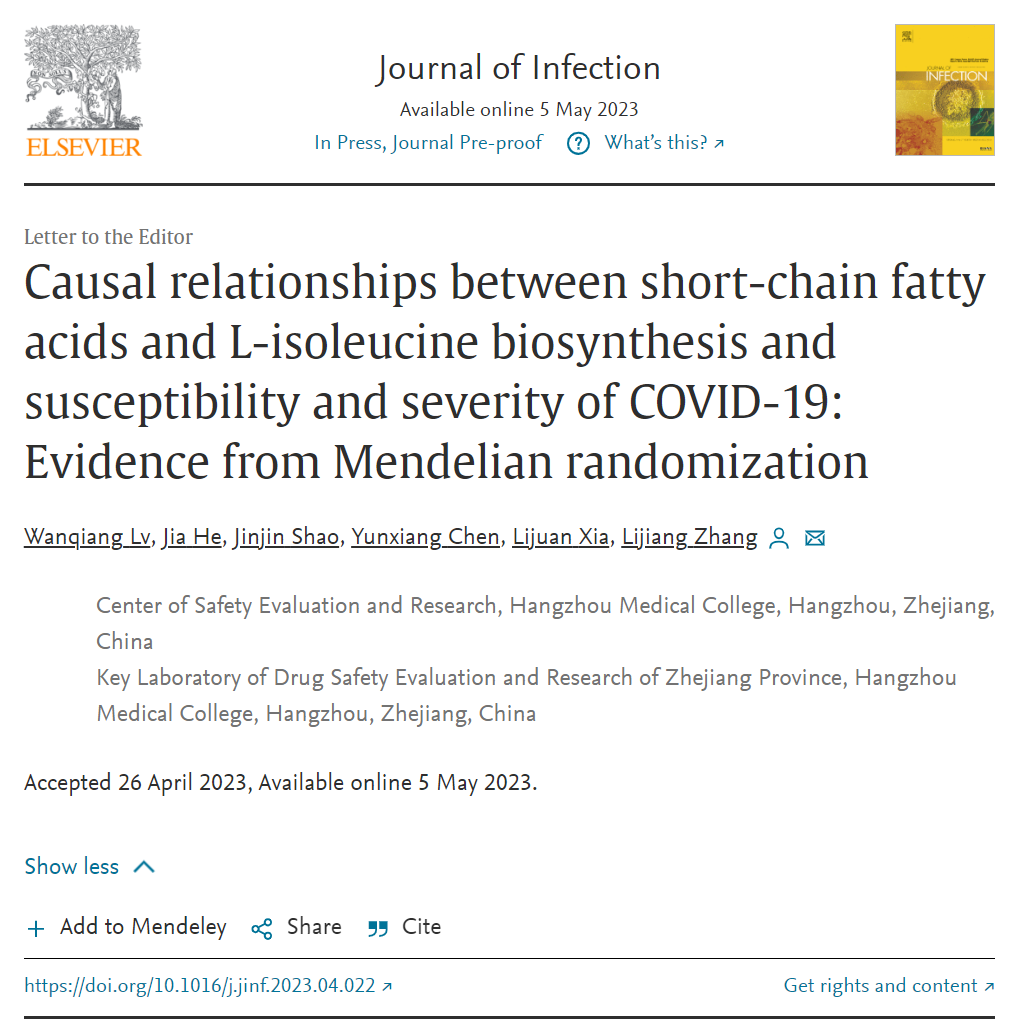2023年5月5日,日韩欧美福利视频_黑人巨大人精品欧美三区_欧美成人另类人妖_欧美在线精品一区二区三区_欧美一区二区三区性视频_日韩精品欧美视频_性欧美极品xxxx欧美一区二区安全性评价研究中心(浙江省药物安全性评价技术研究重点实验室)张立将研究员课题组在国际权威期刊《JOURNAL OF INFECTION》(中科院TOP一区,IF=38.637)以Research Letter的形式在线发表题为“Causal relationships between short-chain fatty acids and L-isoleucine biosesynthesis and susceptibility and severity of COVID-19: Evidence from Mendelian randomization”的研究成果,揭示了肠道菌代谢产物合成与COVID-19易感性和严重性之间的因果关系。张立将研究员为通讯作者,吕万强博士为第一作者。该论文第一单位和通讯单位均为日韩欧美福利视频_黑人巨大人精品欧美三区_欧美成人另类人妖_欧美在线精品一区二区三区_欧美一区二区三区性视频_日韩精品欧美视频_性欧美极品xxxx欧美一区二区。