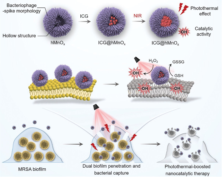 在前期研究基础上,课题组创造性地研制了同时具有刺突结构和光热活性的类病毒仿生纳米酶。通过构建具有病毒刺突结构的纳米酶,最大限度地提高了抗菌纳米酶的细菌细胞膜粘附性能,降低了杀菌物质活性氧自由基(ROS)的扩散距离,改善其抑菌效率。同时,借助抗菌纳米酶的光热性能,破坏紧密连接的生物被膜,提高抗菌纳米酶在生物被膜中的穿透性能,有效对抗深部细菌。
