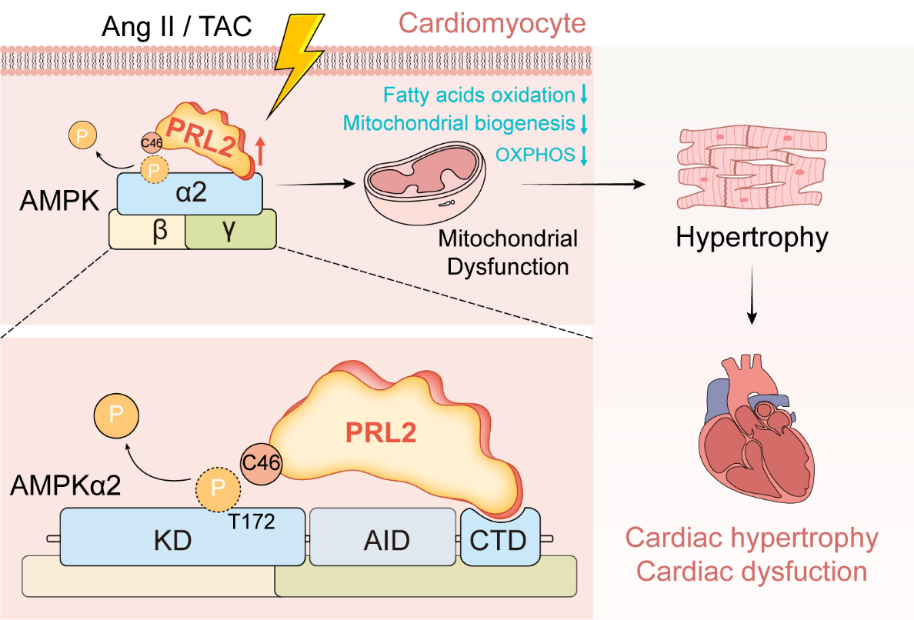综上所述,该工作揭示了PRL2通过调控AMPKα2 T172的去磷酸化,直接介导心肌细胞线粒体功能障碍及病理性心肌肥厚的发生机制(图3)。该研究首次发现PRL2缺失对病理性心脏肥厚具有保护作用,这一突破性发现为心力衰竭的防治提供了新的理论依据。更为重要的是,PRL2作为调控AMPK的磷酸酶在心脏病理进程中发挥关键作用,提示激活AMPK的新途径。从药物研发的角度来看,与直接激活AMPK相比,开发具有高成药性的小分子PRL2抑制剂或将是一条更为便捷的研发路径。针对PRL2的药物抑制或基因治疗有望成为治疗心力衰竭的潜在新策略。
