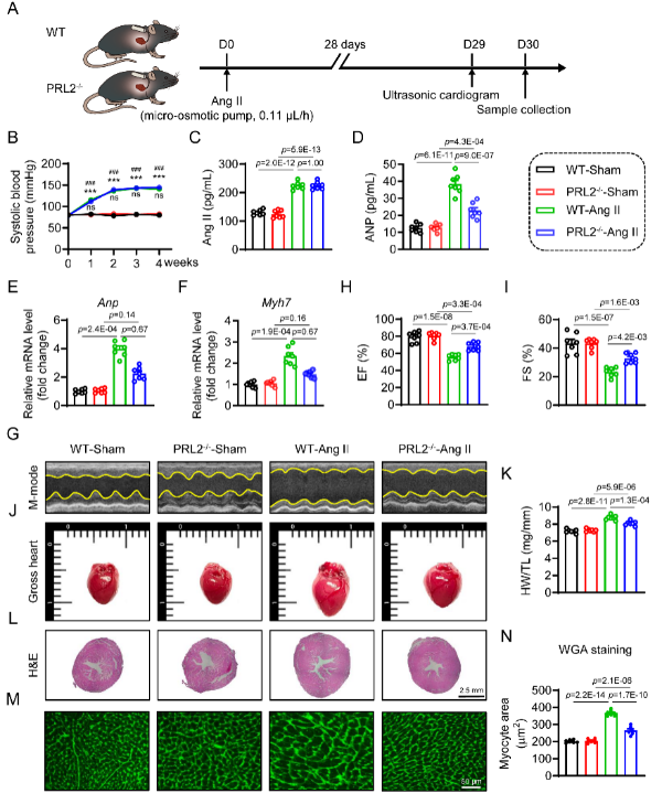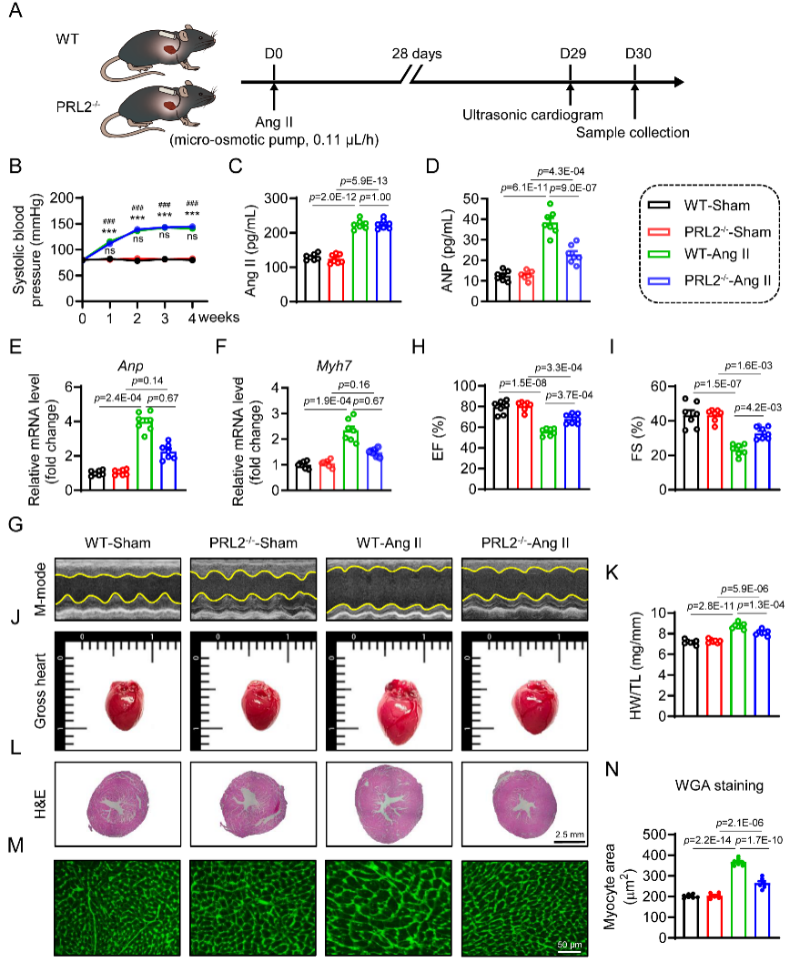 图1. PRL2缺失改善Ang II诱导的小鼠心功能不全和心肌肥厚
