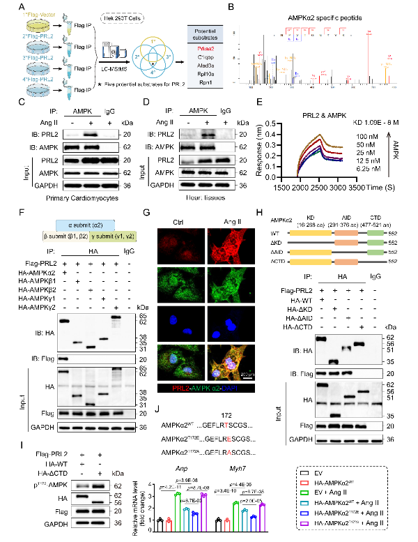 为了明确PRL2调控AMPK去磷酸化的潜在分子机制,我们通过液相质谱-串联质谱(LC-MS/MS)、免疫共沉淀(Co-IP)、生物膜干涉技术(BLI)等实验进一步确认PRL2与AMPKα2 CTD结构域结合,并通过C46酶活位点去磷酸化AMPK T172,进而诱导心肌细胞能量代谢障碍和心肌肥厚(图2)。