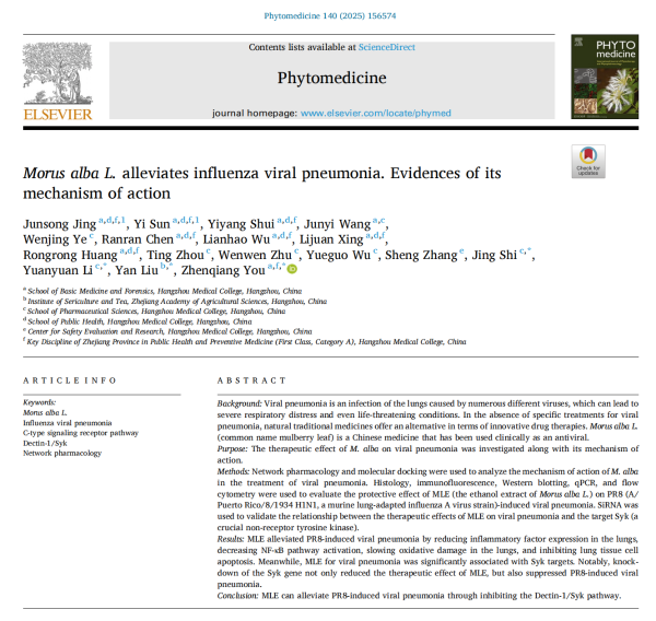 2025年2月26日,我校由振强研究员在《Phytomedicine》(中科院一区top,IF=6.7)上在线发表了题为“Morus alba L. alleviates influenza viral pneumonia. Evidences of its mechanism of action”的研究论文。