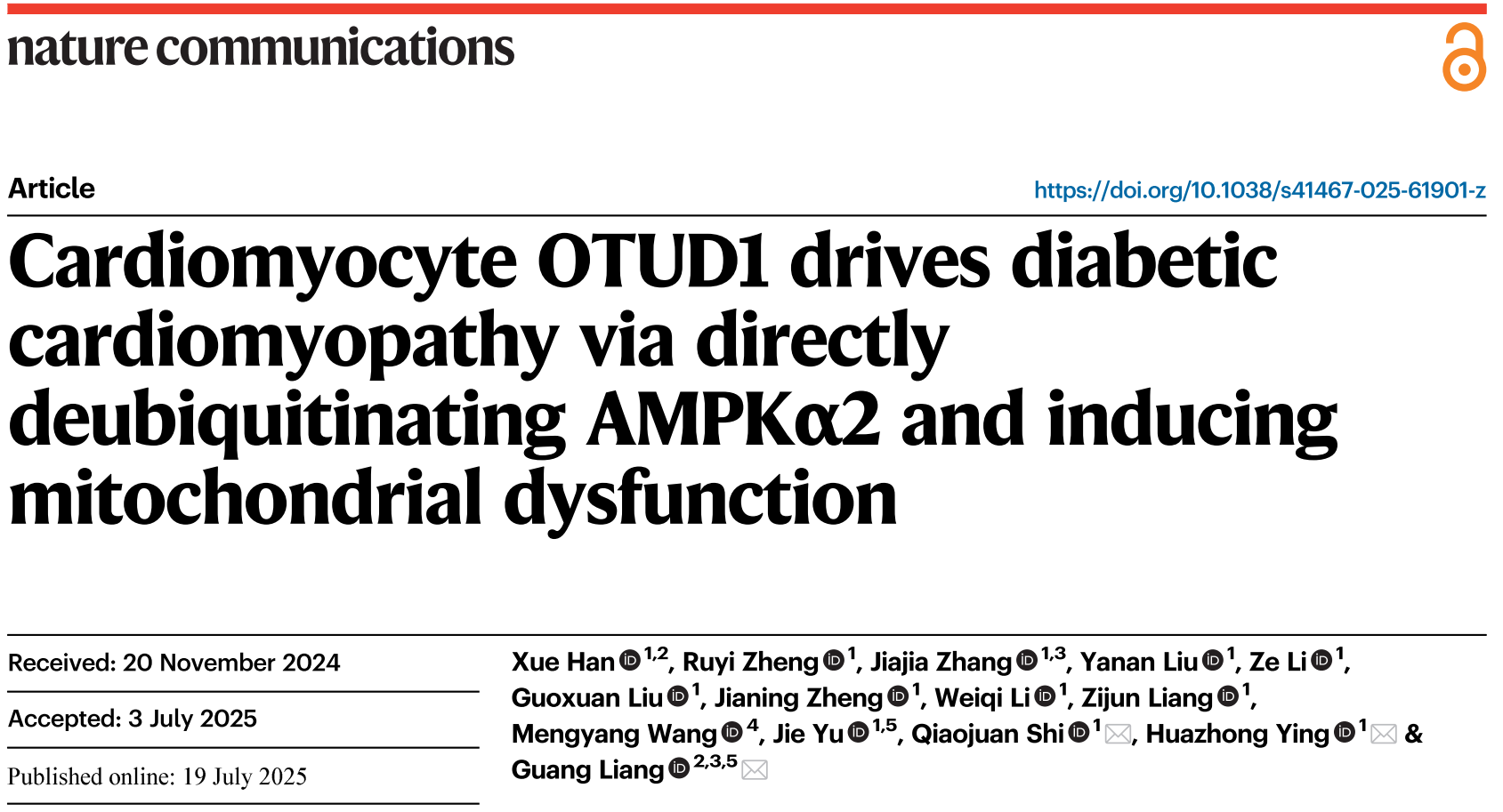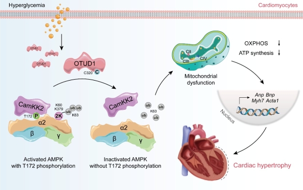 近日,我校梁广课题组联合应华忠/石巧娟课题组在国际权威期刊《Nature Communications》(中科院一区TOP,IF=15.7)在线发表了题为“Cardiomyocyte OTUD1 drives diabetic cardiomyopathy via directly deubiquitinating AMPKα2 and inducing mitochondrial dysfunction”的研究性论文。该研究首次揭示了心肌细胞中去泛素化酶OTUD1在糖尿病心肌病发生发展中的核心作用及其分子机制。研究团队创新性地发现,OTUD1能够直接结合并特异性去泛素化能量代谢关键激酶AMPKα2的K60/K379位点,进而抑制其T172位点的关键磷酸化,最终导致心肌细胞线粒体功能障碍,驱动糖尿病心肌病病理进程。这一突破性发现不仅阐明了OTUD1-AMPKα2信号轴在糖尿病心肌病中的核心调控机制,为理解DCM的分子基础提供了新视角,更提示靶向OTUD1是治疗糖尿病心肌病的潜在新策略,具有重要的临床转化意义。