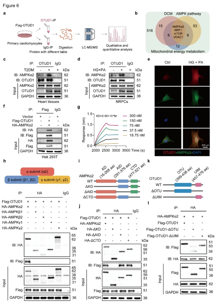 DUBs通过识别并去泛素化特定底物蛋白发挥功能。为鉴定心肌细胞中OTUD1的潜在靶点,研究人员采用免疫共沉淀(Co-IP)、液相质谱-串联质谱(LC-MS/MS)、生物膜干涉技术(BLI)等实验,从OTUD1结合蛋白中筛选出其底物蛋白AMPKα2。结构域分析揭示,OTUD1其通过OUT结构域与AMPKα2的激酶结构域(KD)特异性相互作用(图3)。这一发现首次鉴定AMPKα2为心肌细胞OTUD1的关键生理底物。