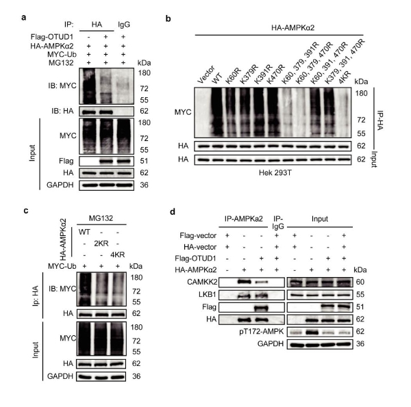 图4. OTUD1通过去泛素化AMPKα2- K60/K379位点调控其磷酸化