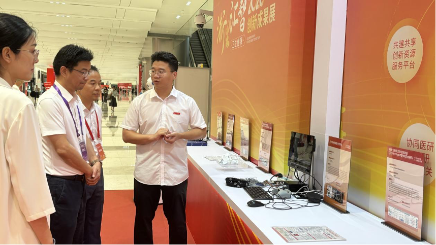 当天下午,浙江省卫生健康委员会党委委员、副主任林杰莅临我校展位参观。李书五详细介绍了设备的研发原理、应用场景及临床进展。林杰对该成果在AD早期诊断领域的创新价值表示肯定,并鼓励团队加快成果转化,助力生命健康产业发展。
